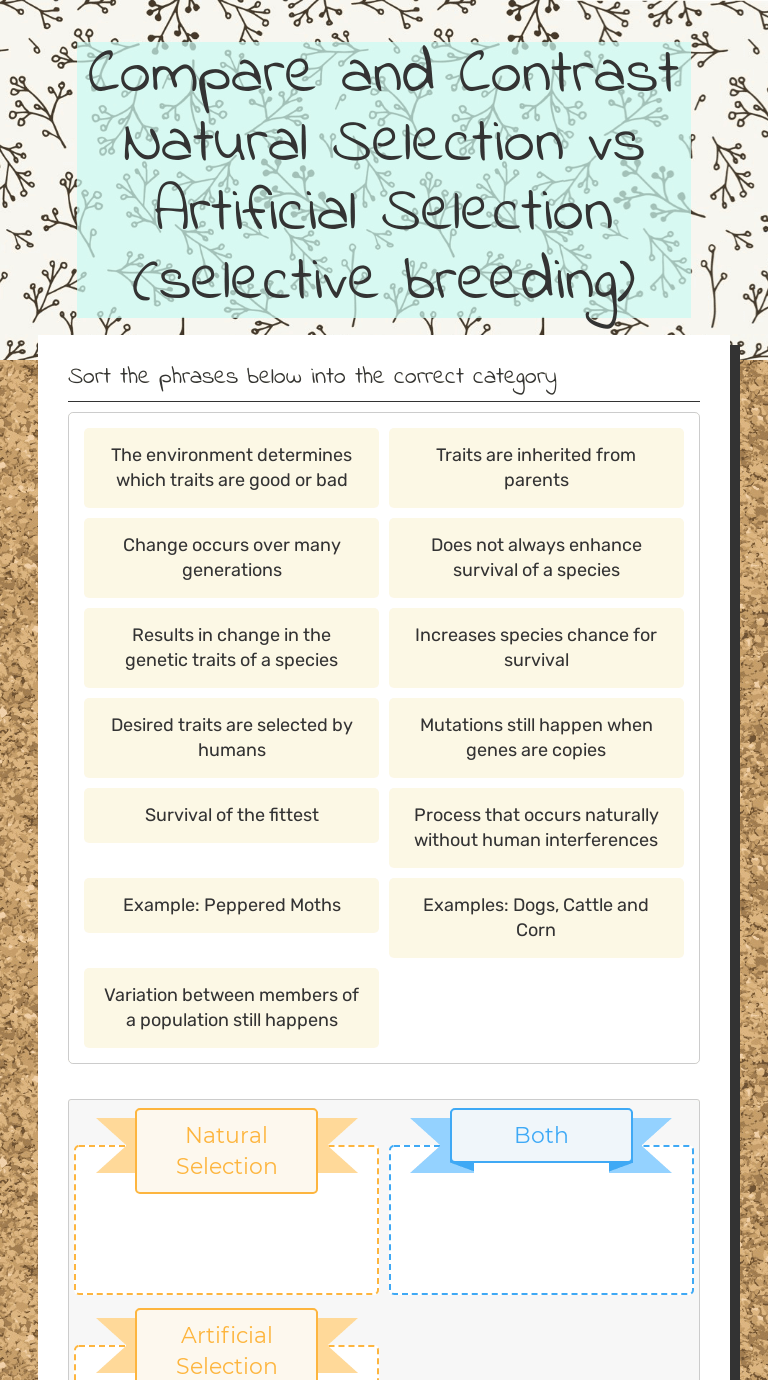 He then began a review of his collected data, thinking about what process could produce the changes in the species he studied on the galapagos islands. Some of the worksheets for this concept are selective breeding, artificial selection evolution in practice, lesson life science genetics selective breeding, student exploration evolution natural and artificial, natural selection teacher handout, vocabulary work. Artificial selection science start practising. A humans select desirable traits in plants or animals and breed together the … In this worksheet, we will practice outlining the process of artificial selection and describing how humans can use artificial selection to produce desired organisms. Darwin then proposed the … They are artificial) rather than by the animal breeding all domesticated animals — such as dogs, cats, sheep, horses, and cows — are the products of … Types of artificial selection other contents: Which of the following best defines artificial selection? Artificial selection and natural selection darwin returned to england in 1836 and became an accepted member of the scientific community. The important difference between the two is that the selection pressures in artificial selection are (i.e. Artificial selection also causes the alleles that are selected to become in the population over time, causing the. This worksheet and quiz will allow you to test the following skills: